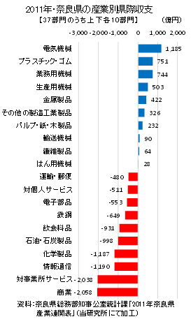 奈良県の産業別県際収支(37部門)をみると、電気機械、プラスチック・ゴム、業務用機械等が移輸出超過となっているが、05年比で県内生産額が81.9%減少した電子部品が553億円の移輸入超過となったほか、対事業所サービスと商業が2千億円以上の移輸入超過となっている。